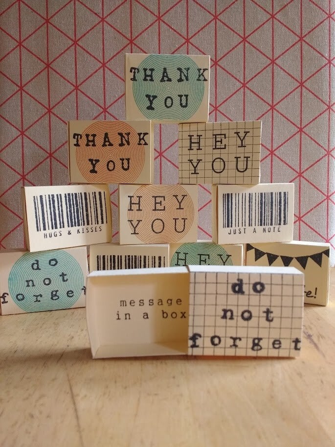 Heerlijk alternatief voor een kaartje: een (lucifer)dozeke. Een klein fijn cadeautje waar ik al menig ontvanger mee kon verblijden. Gevuld met een vlaggetjeslijn, een mini-banner, een collage in reliëf, confetti, magneetjes, boeketje bloemen, popupkubussen,...